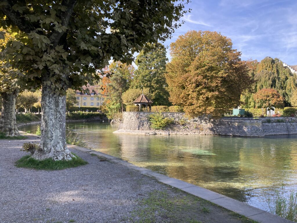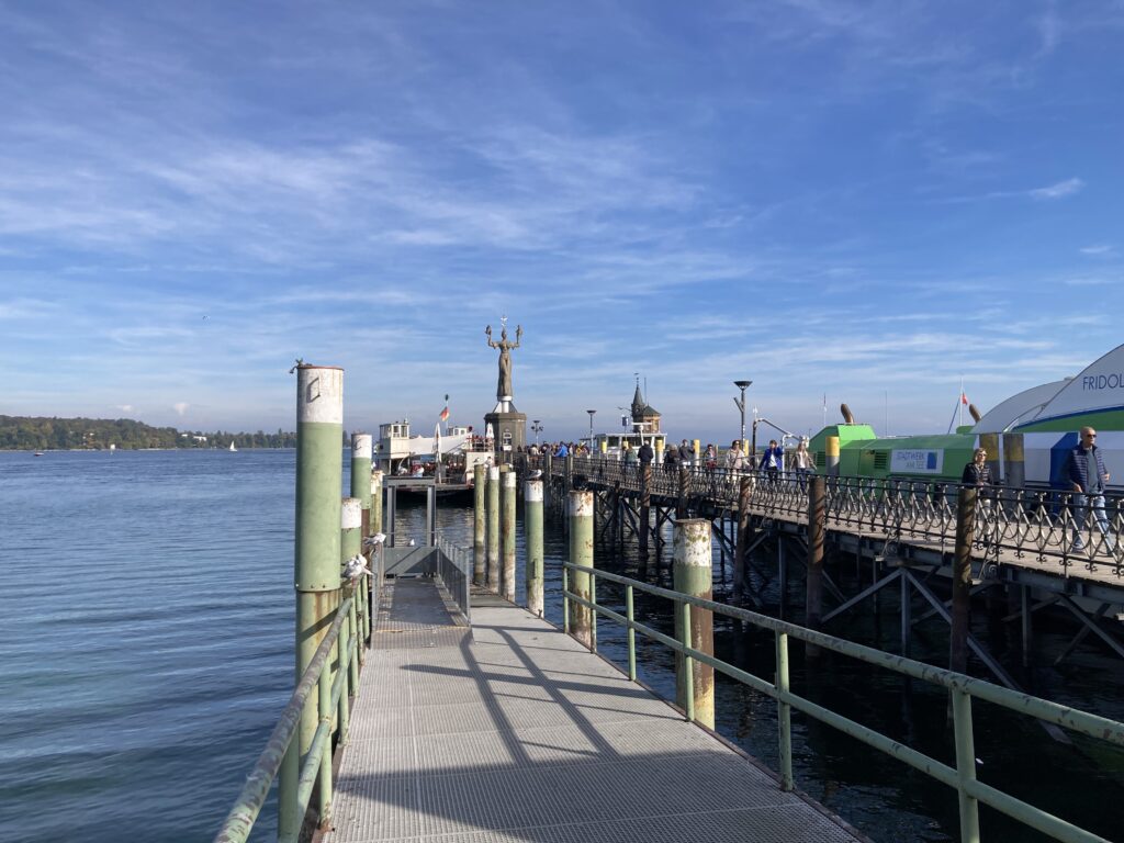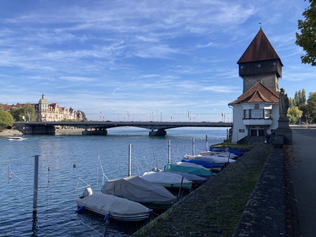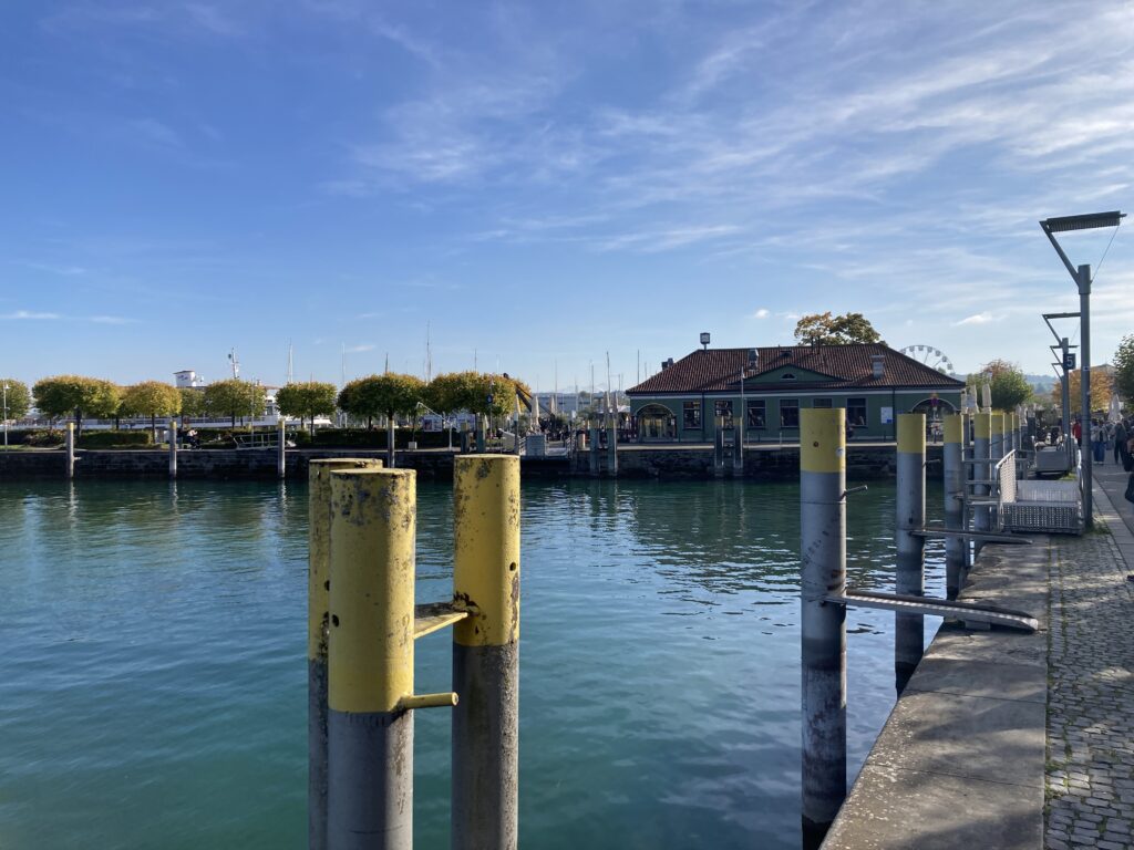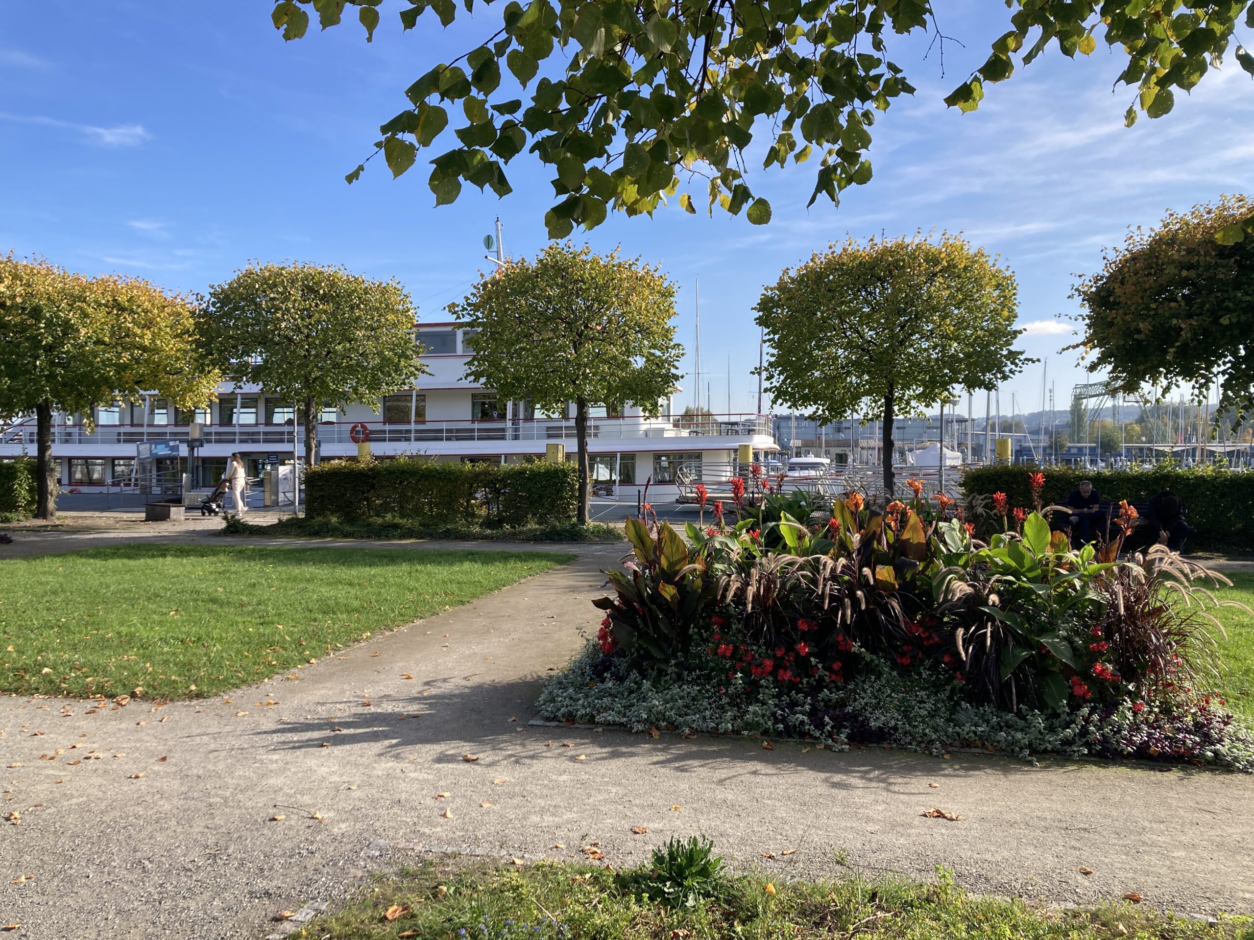 Vom Bahnhof führte der Weg direkt ans Wasser. Der Hafen mit Imperia, die breiten Stege, die ruhigen Sitzbereiche am See – alles wirkte offen und entspannt. Der Herbst zeigte sich mit intensiven Farben: gelbe Blätter an den Bäumen, klare Kontraste, lange Schatten. Am Stadtpark direkt am See war die Atmosphäre ideal für ein paar Stunden konzentriertes Arbeiten am Laptop. Unter freiem Himmel, begleitet vom leichten Wind und dem rhythmischen Geräusch der Wellen, entstand ein ungeplanter, aber produktiver Arbeitsmoment.