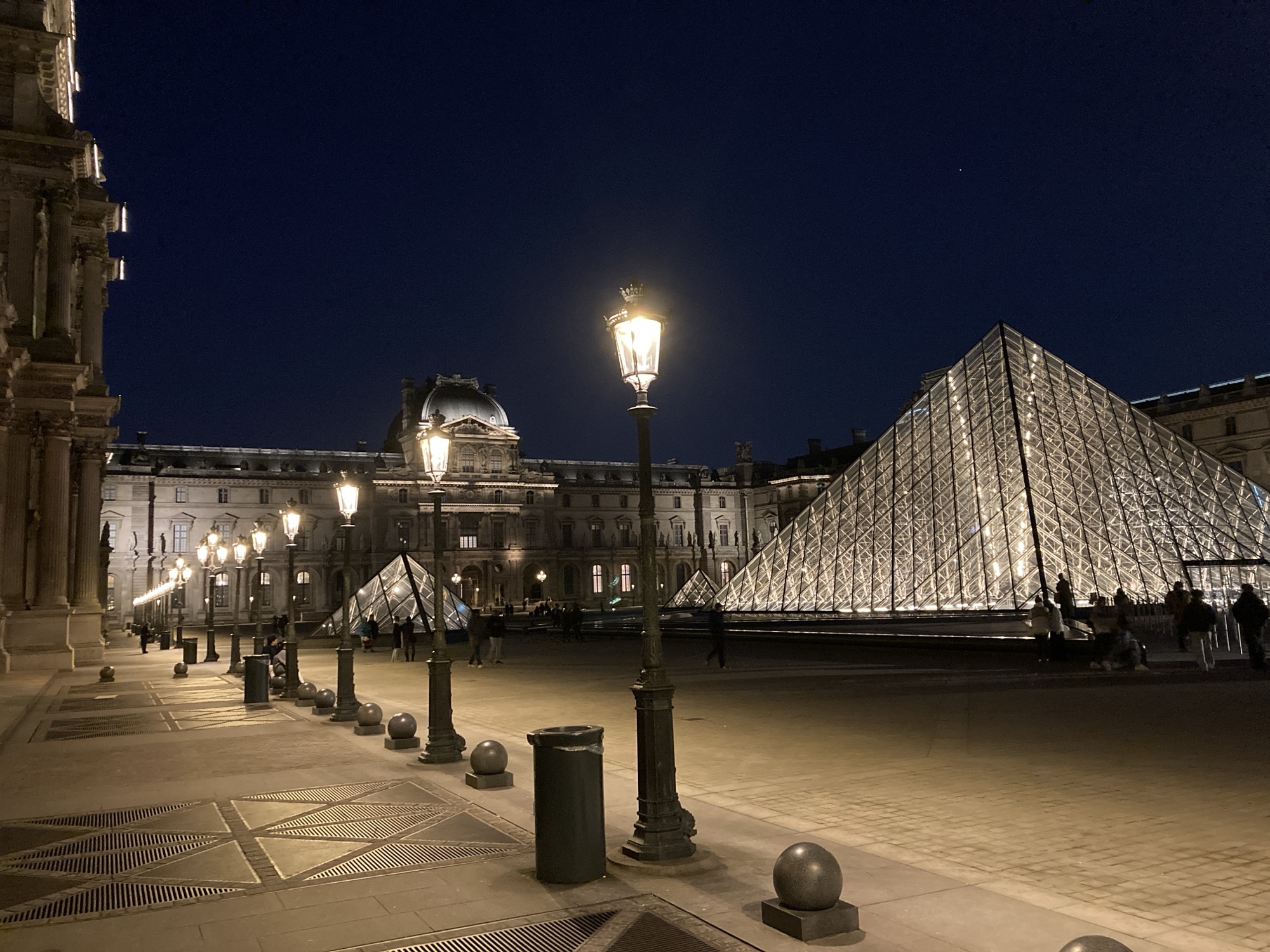 Nach dem Check-in zog es mich gleich weiter Richtung Louvre. Die blaue Stunde begann gerade, und mit jedem Schritt wurde die Stimmung intensiver. Als ich die Glaspyramiden erreichte, leuchteten sie in warmem Gold, während die umliegende Architektur in ein tiefes, ruhiges Blau getaucht war. Es war einer dieser Momente, in denen Stadt und Licht perfekt ineinander greifen.