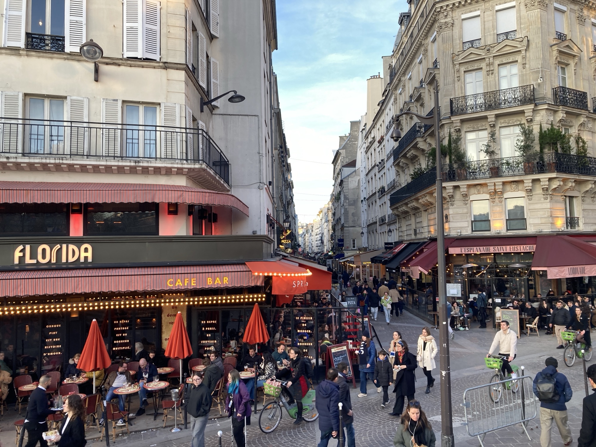 Von dort aus lief ich die knapp einen Kilometer bis zu meinem Hotel. Gleich auf den ersten Metern merkte ich: Paris hat ein anderes Tempo. Autos hupten, Menschen spurteten an mir vorbei, eine dauerhafte Unruhe lag in der Luft. Doch je näher ich den bekannten Sehenswürdigkeiten kam, desto weicher wurde die Atmosphäre. Die Straßen wurden malerischer, Cafés mit kleinen Tischen draußen säumten die Wege, Lichterketten hingen über den Terrassen – genau dieses typische Pariser Straßenbild, das man sofort wiedererkennt.