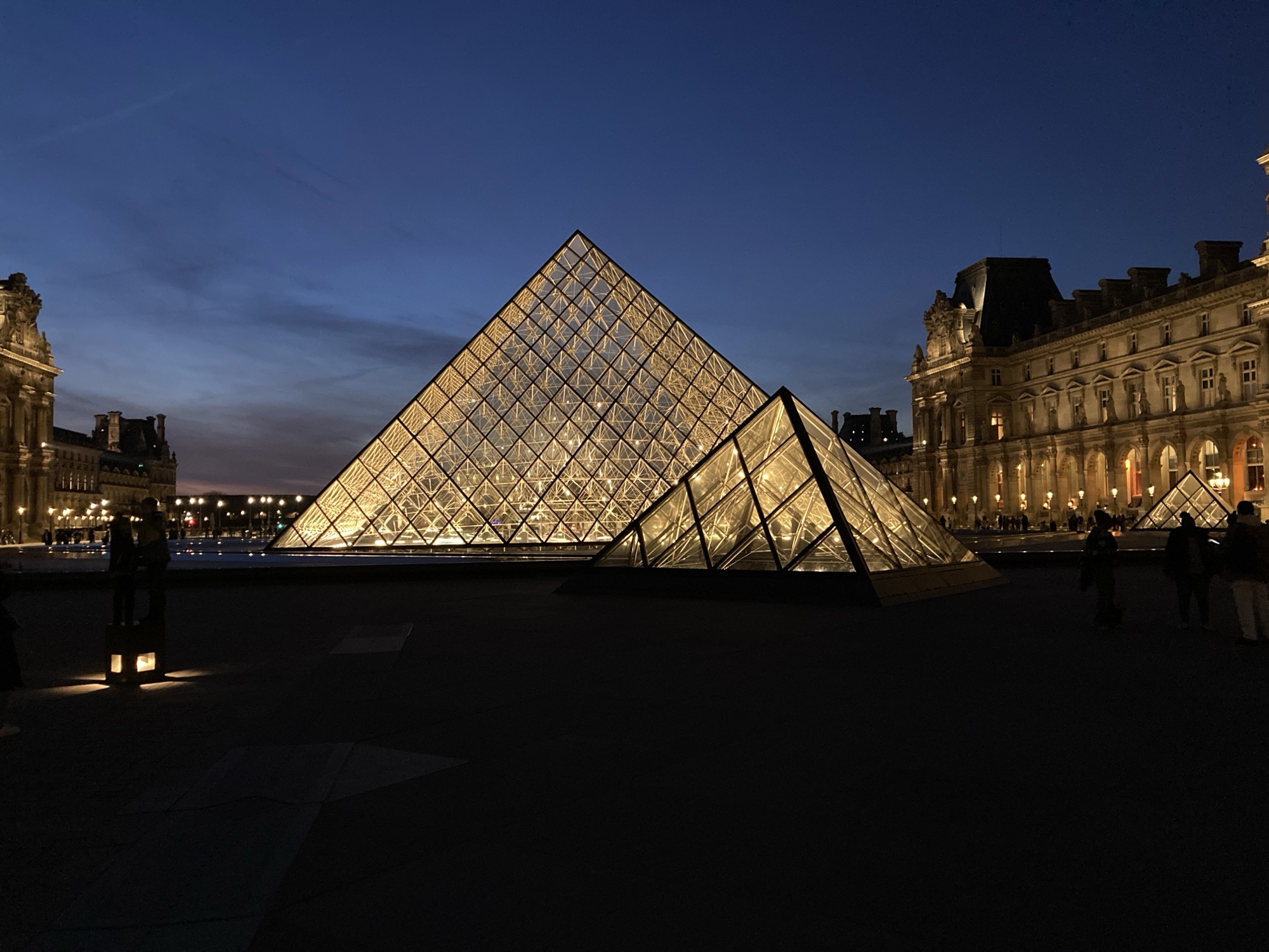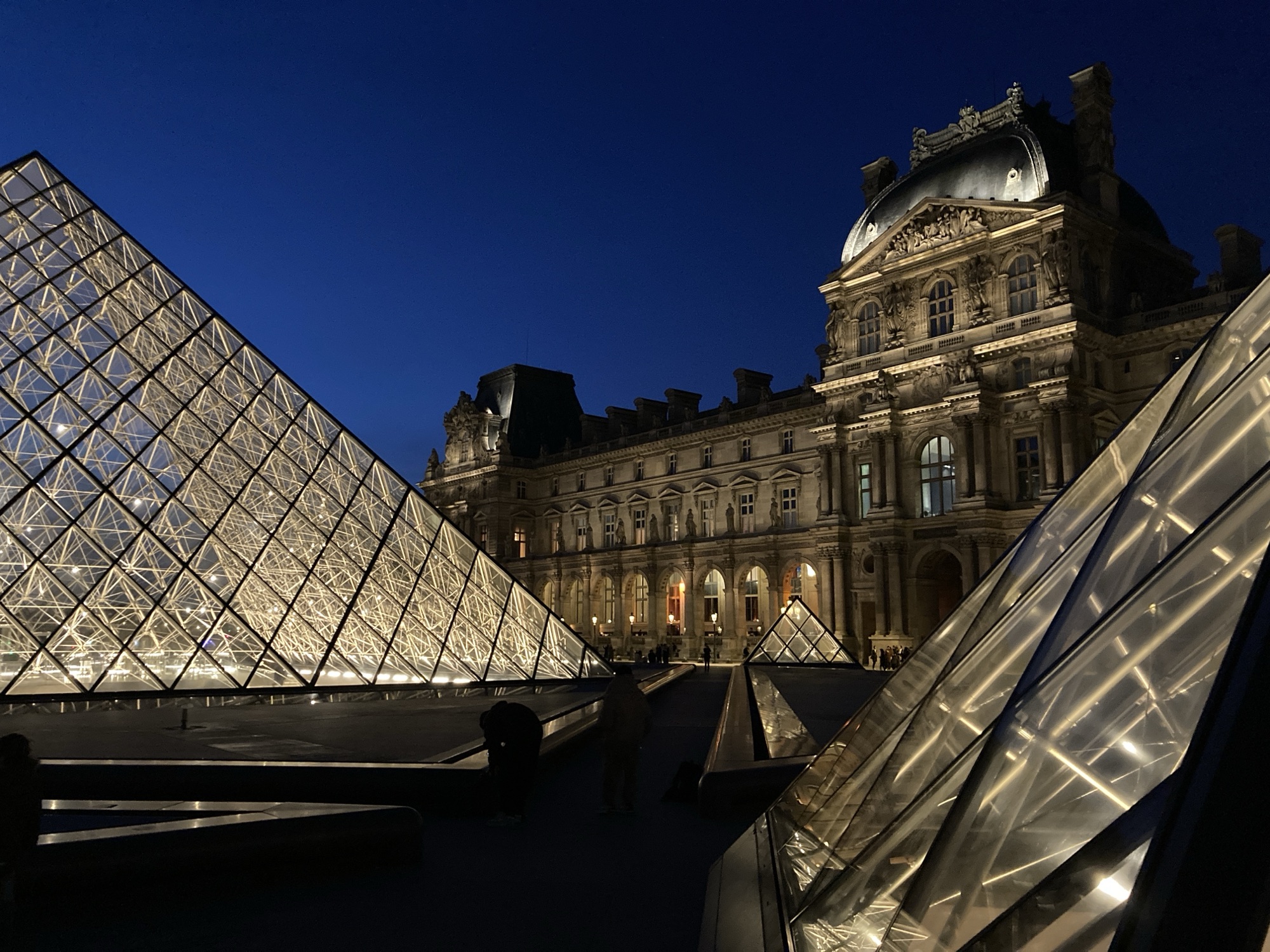 Nach dem Check-in zog es mich gleich weiter Richtung Louvre. Die blaue Stunde begann gerade, und mit jedem Schritt wurde die Stimmung intensiver. Als ich die Glaspyramiden erreichte, leuchteten sie in warmem Gold, während die umliegende Architektur in ein tiefes, ruhiges Blau getaucht war. Es war einer dieser Momente, in denen Stadt und Licht perfekt ineinander greifen.
