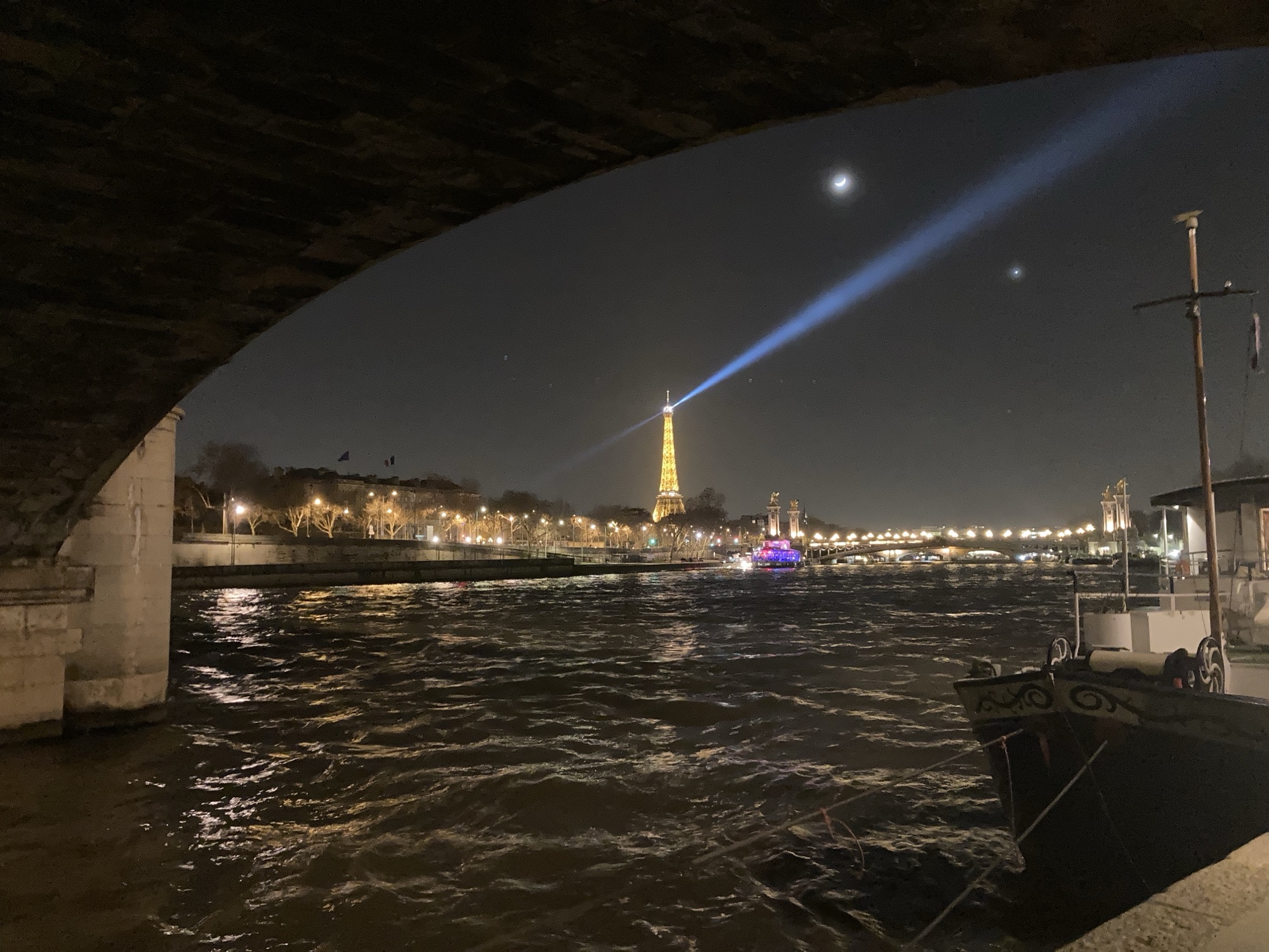 Ich ging weiter durch den Arc de Triomphe du Carrousel, dessen Figuren und Reliefs im warmen Licht fast schwebten bis hinunter zur Seine. Am Ufer entlang, vorbei an fest vertäuten Booten, hatte ich plötzlich einen freien Blick auf den Eiffelturm. Genau in diesem Moment begann er zu funkeln – tausende kleine Lichter, dazu der große Lichtstrahl, der wie ein Leuchtturm über die Stadt schwenkt. Ein Anblick, der jedes Mal aufs Neue überrascht, egal wie oft man ihn sieht.