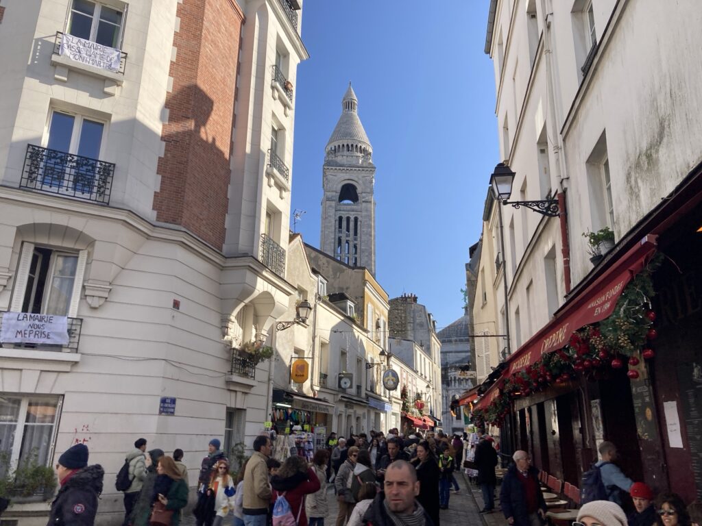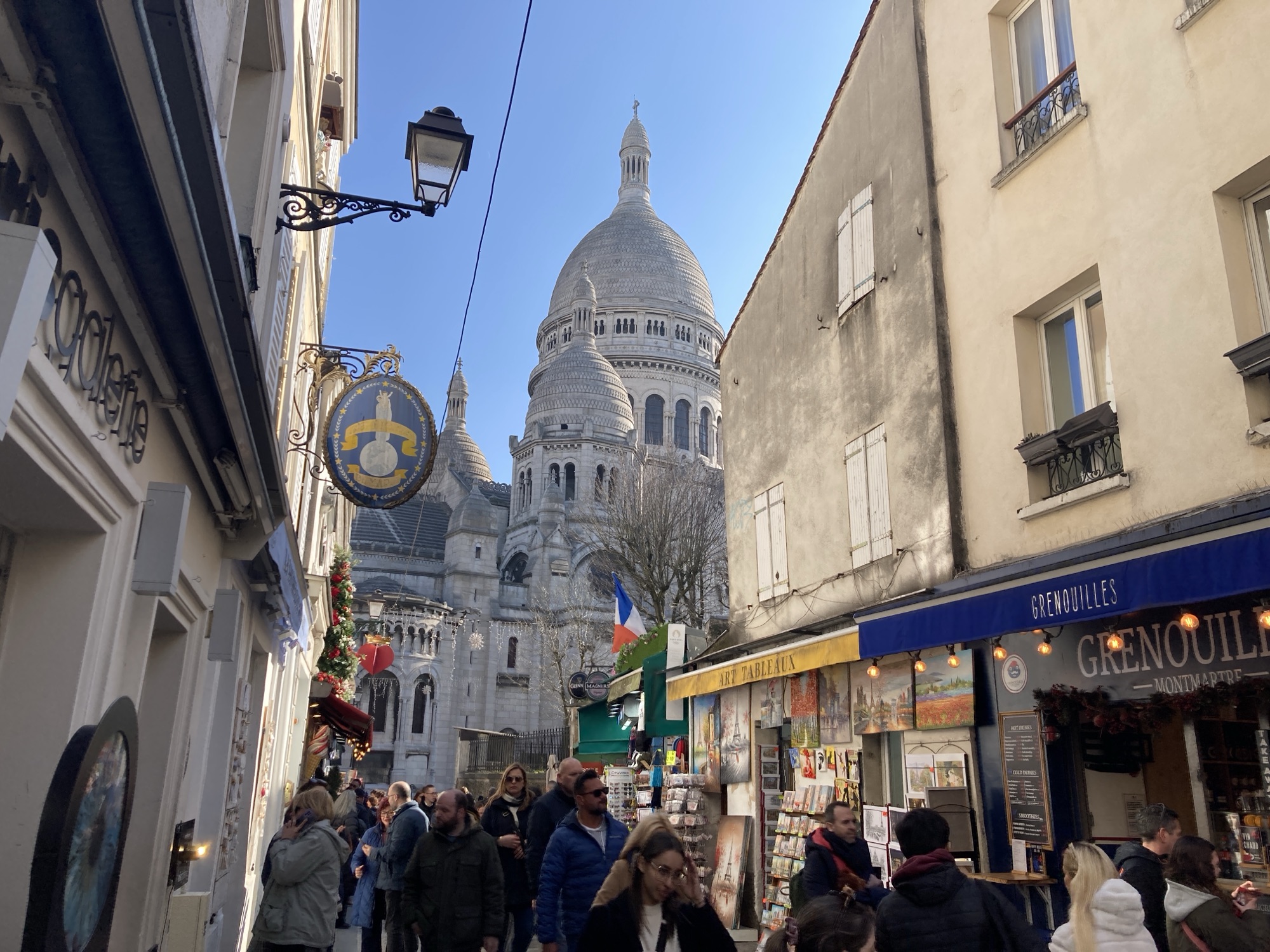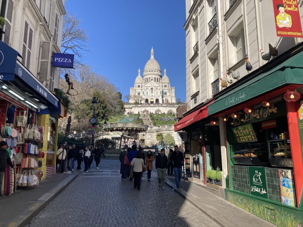 Je näher ich Montmartre kam, desto steiler wurden die Gassen. Schließlich stand ich vor den berühmten Treppen, die im hellen Licht glänzten. Der Aufstieg war kurz, aber intensiv – Stufe für Stufe öffnete sich die Aussicht über die Stadt, bis ich oben schließlich das volle Panorama vor mir hatte. Die Kuppel der Sacré-Cœur funkelte im Sonnenlicht, und die Plätze ringsum waren voller Leben: Touristen, Straßenkünstler, Musiker, Maler und die unzähligen Souvenirverkäufer, die Montmartre seinen typischen Rhythmus geben.