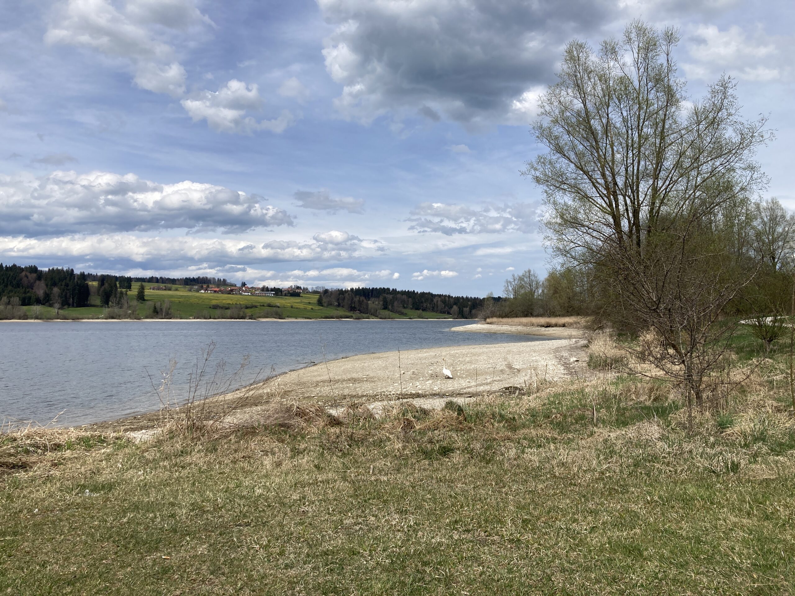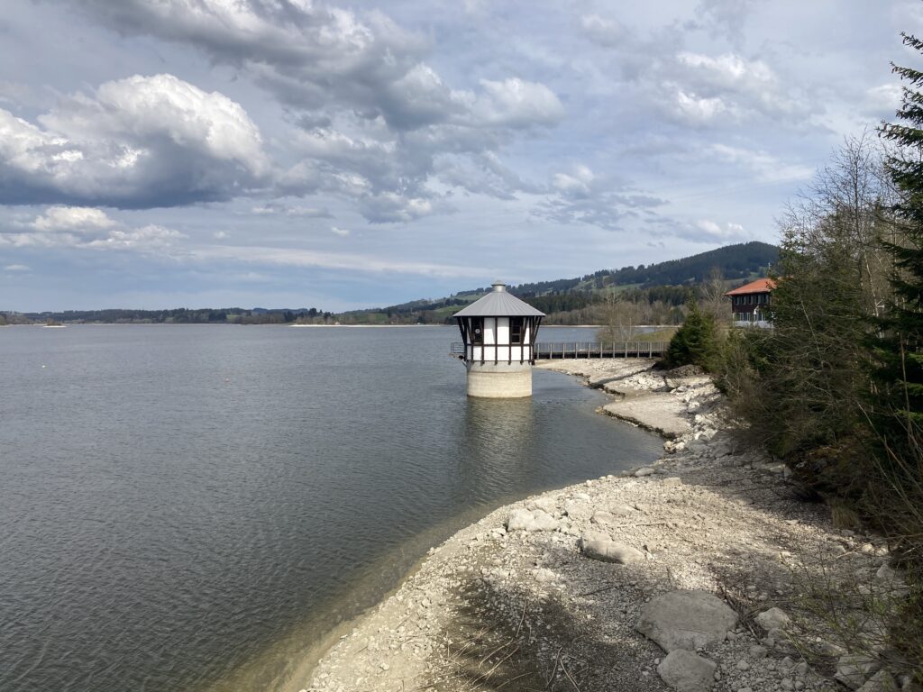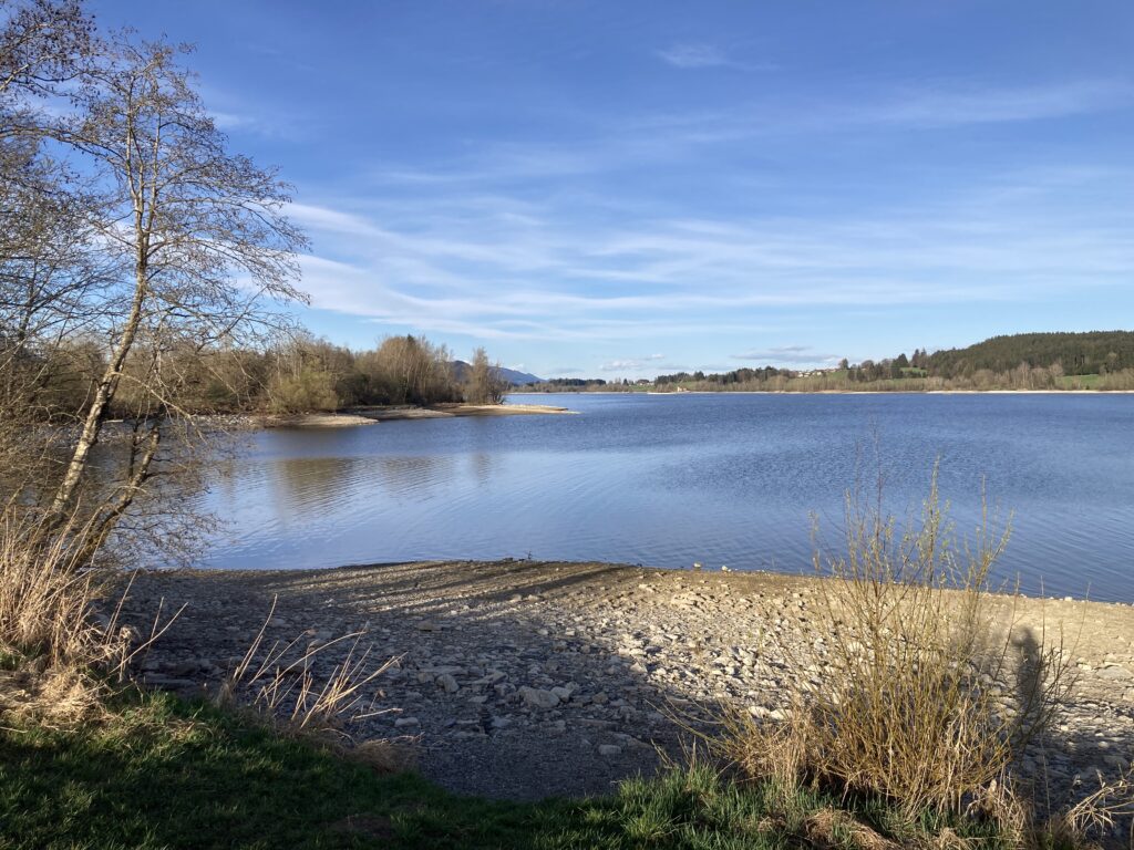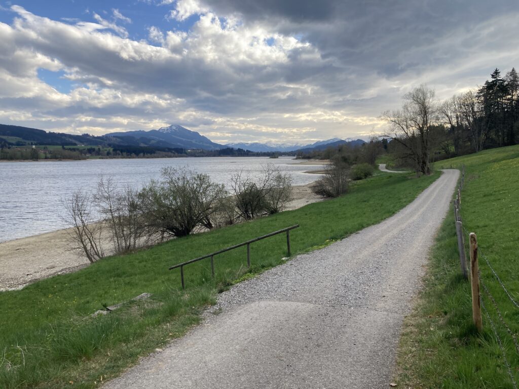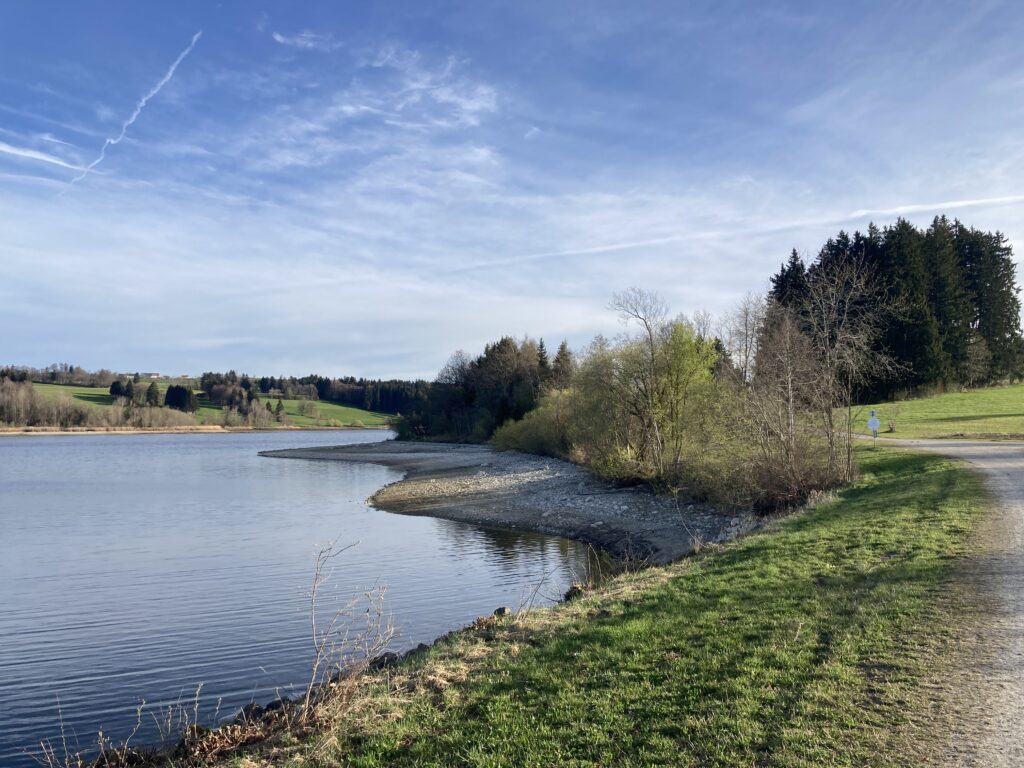 Der See wurde in den 1990er-Jahren als Stausee angelegt und verbindet heute Erholung, Naturraum und sanften Tourismus. Rund um das Ufer führen gut ausgebaute Wege, die sich ideal für Spaziergänge, Radtouren oder eine entspannte Runde zum Sonnenuntergang eignen. Immer wieder öffnen sich Perspektiven auf das Wasser, auf grüne Wiesen und – bei klarer Sicht – auf die markanten Gipfel der Allgäuer Alpen.