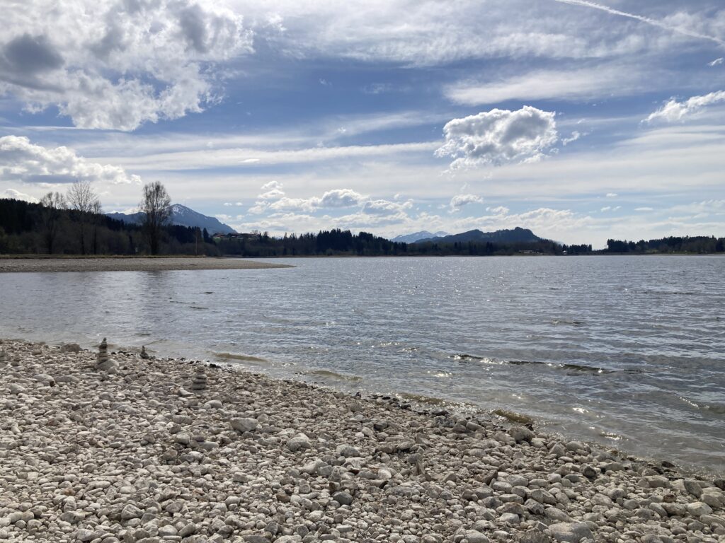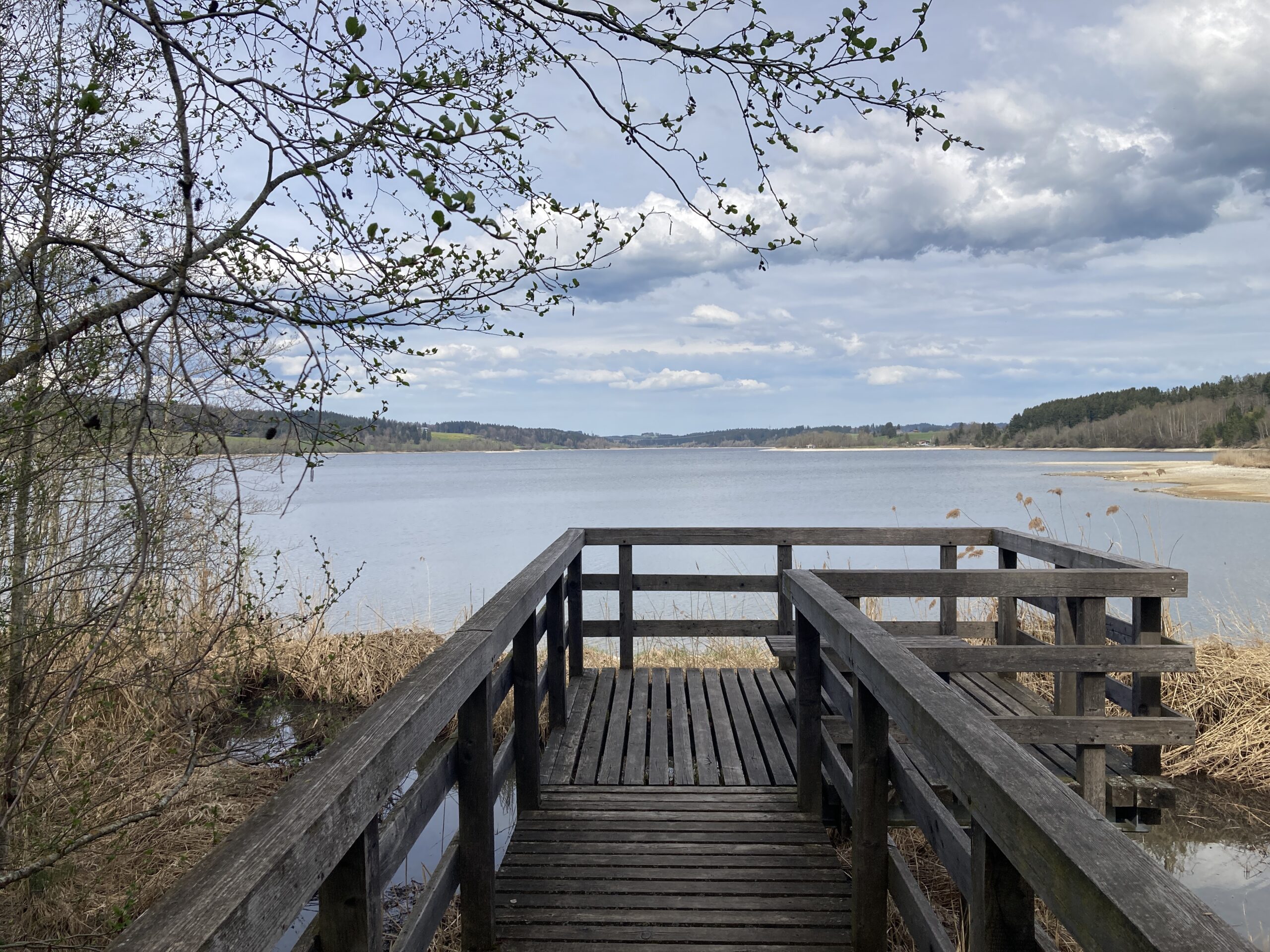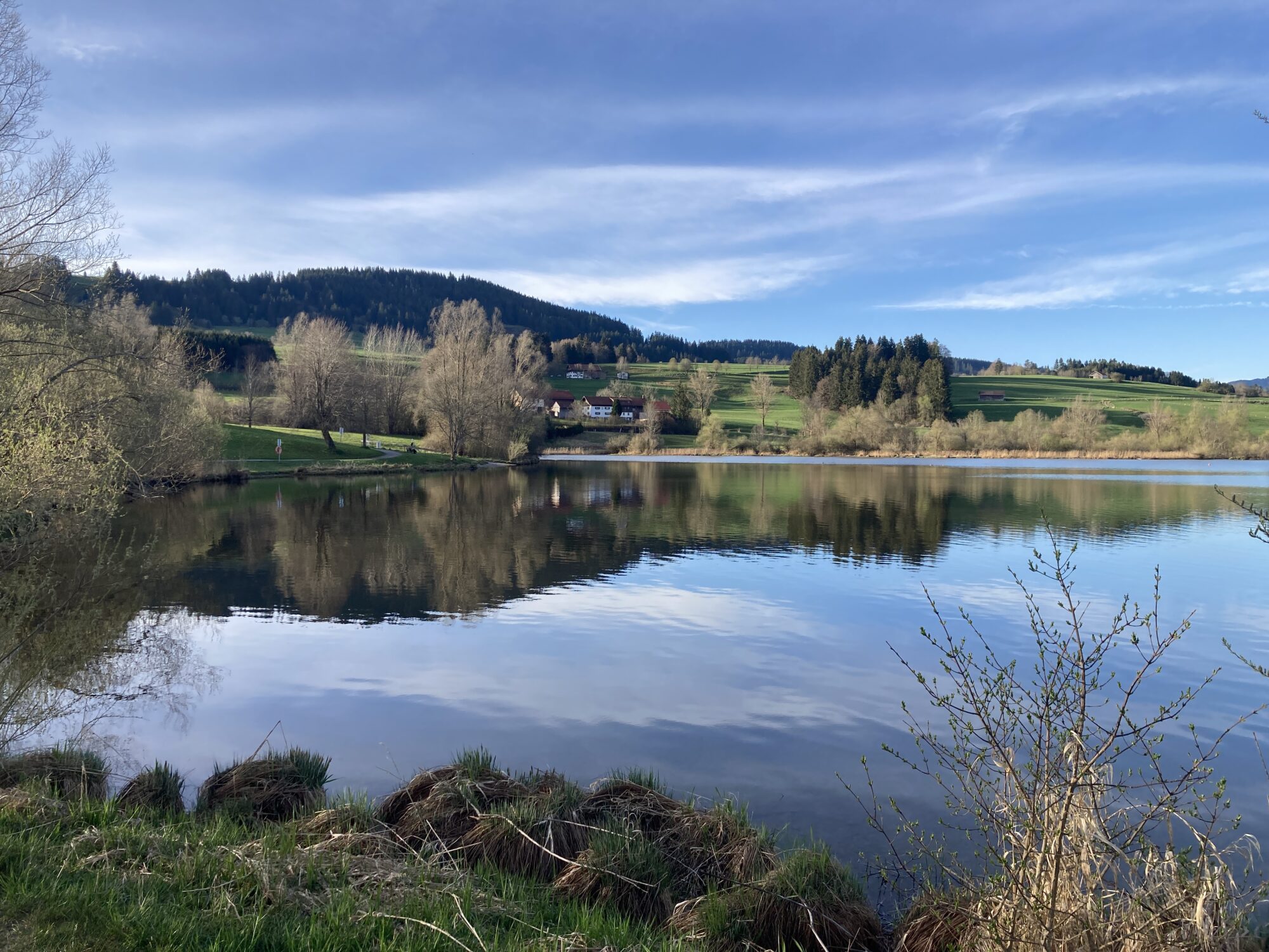 Der See wurde in den 1990er-Jahren als Stausee angelegt und verbindet heute Erholung, Naturraum und sanften Tourismus. Rund um das Ufer führen gut ausgebaute Wege, die sich ideal für Spaziergänge, Radtouren oder eine entspannte Runde zum Sonnenuntergang eignen. Immer wieder öffnen sich Perspektiven auf das Wasser, auf grüne Wiesen und – bei klarer Sicht – auf die markanten Gipfel der Allgäuer Alpen.