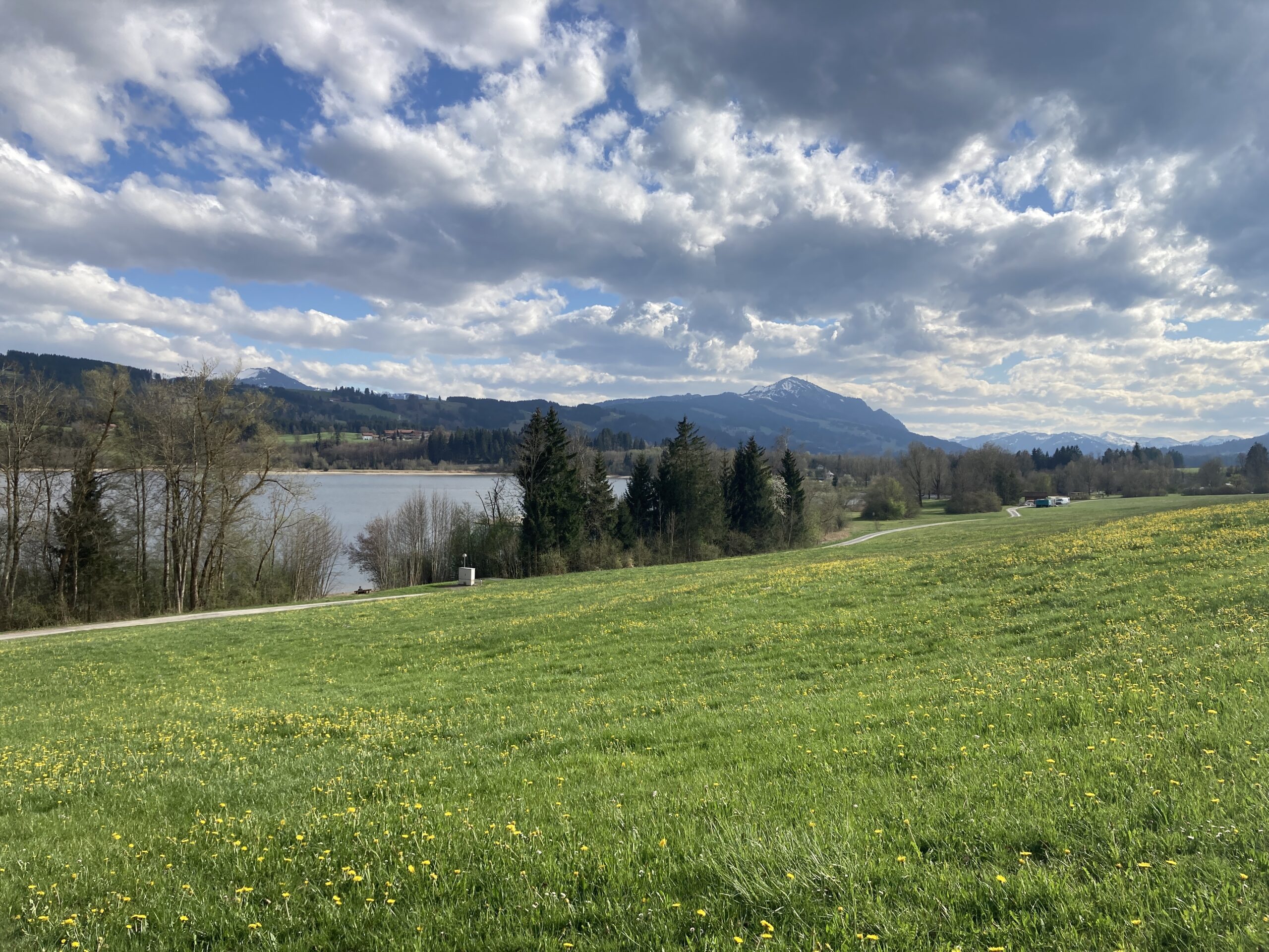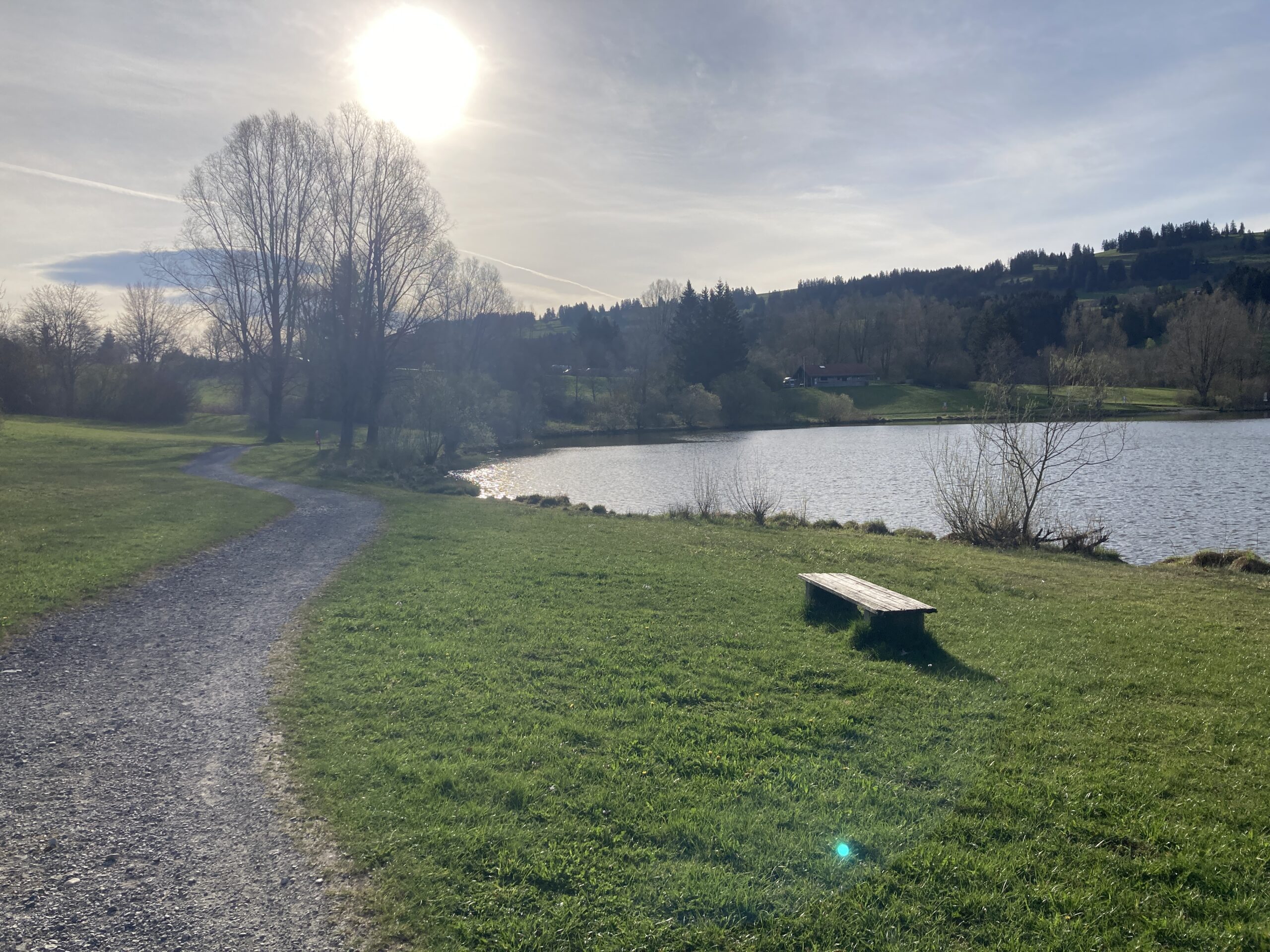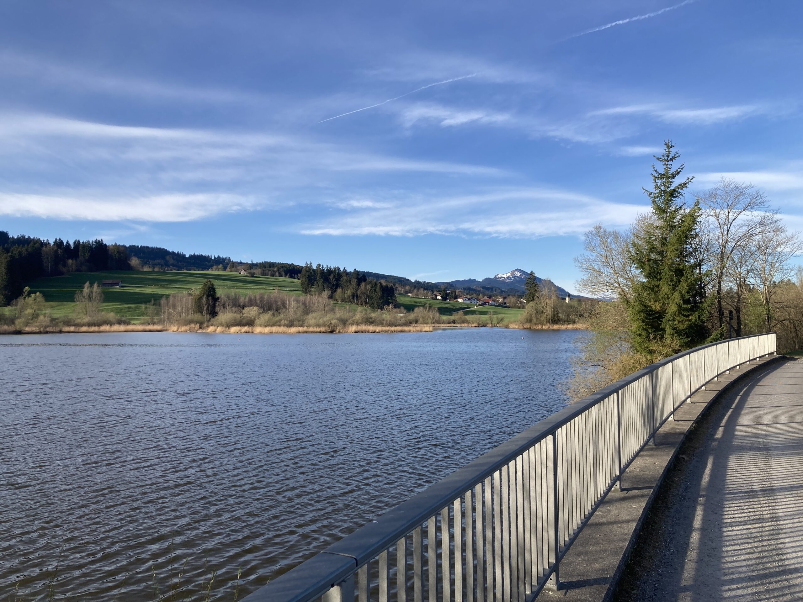 Der See wurde in den 1990er-Jahren als Stausee angelegt und verbindet heute Erholung, Naturraum und sanften Tourismus. Rund um das Ufer führen gut ausgebaute Wege, die sich ideal für Spaziergänge, Radtouren oder eine entspannte Runde zum Sonnenuntergang eignen. Immer wieder öffnen sich Perspektiven auf das Wasser, auf grüne Wiesen und – bei klarer Sicht – auf die markanten Gipfel der Allgäuer Alpen.