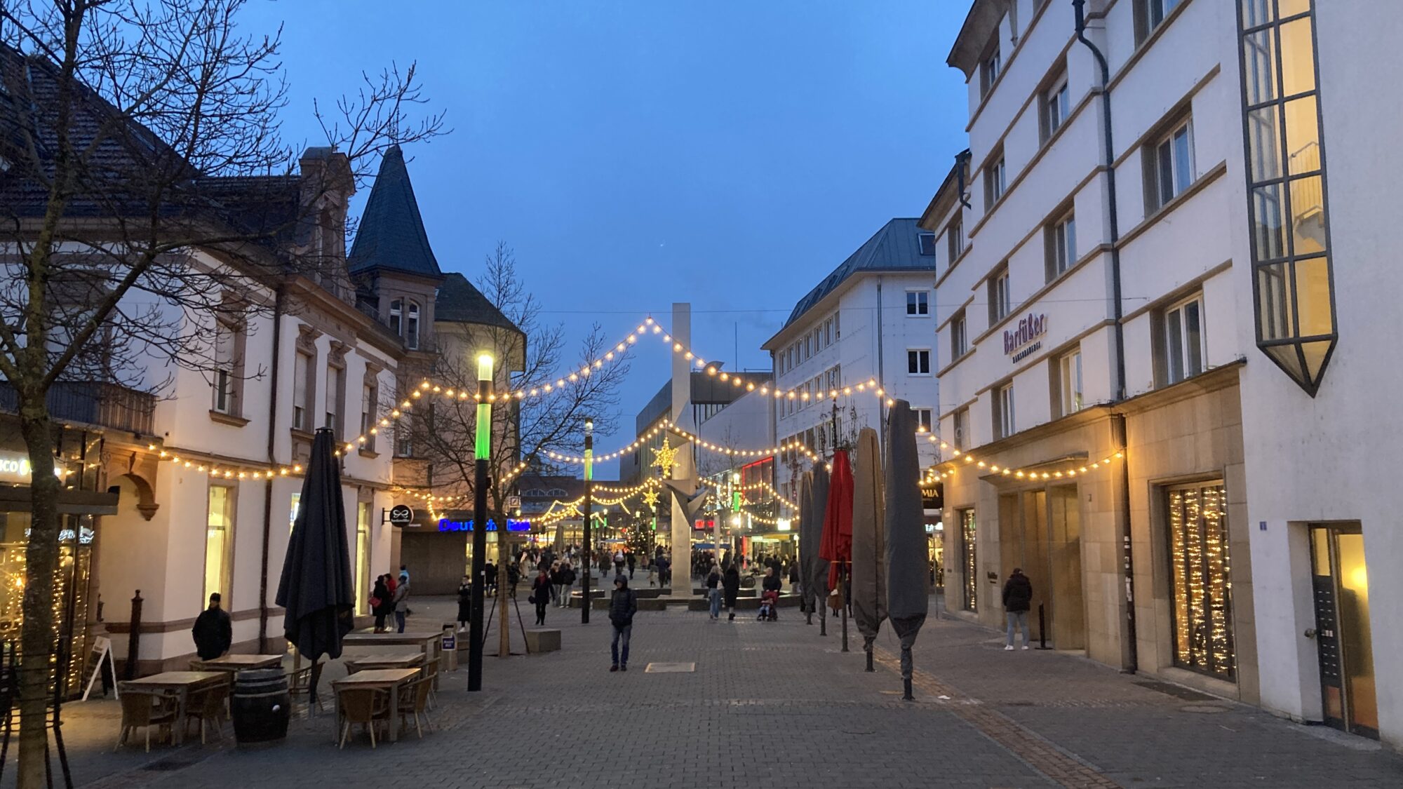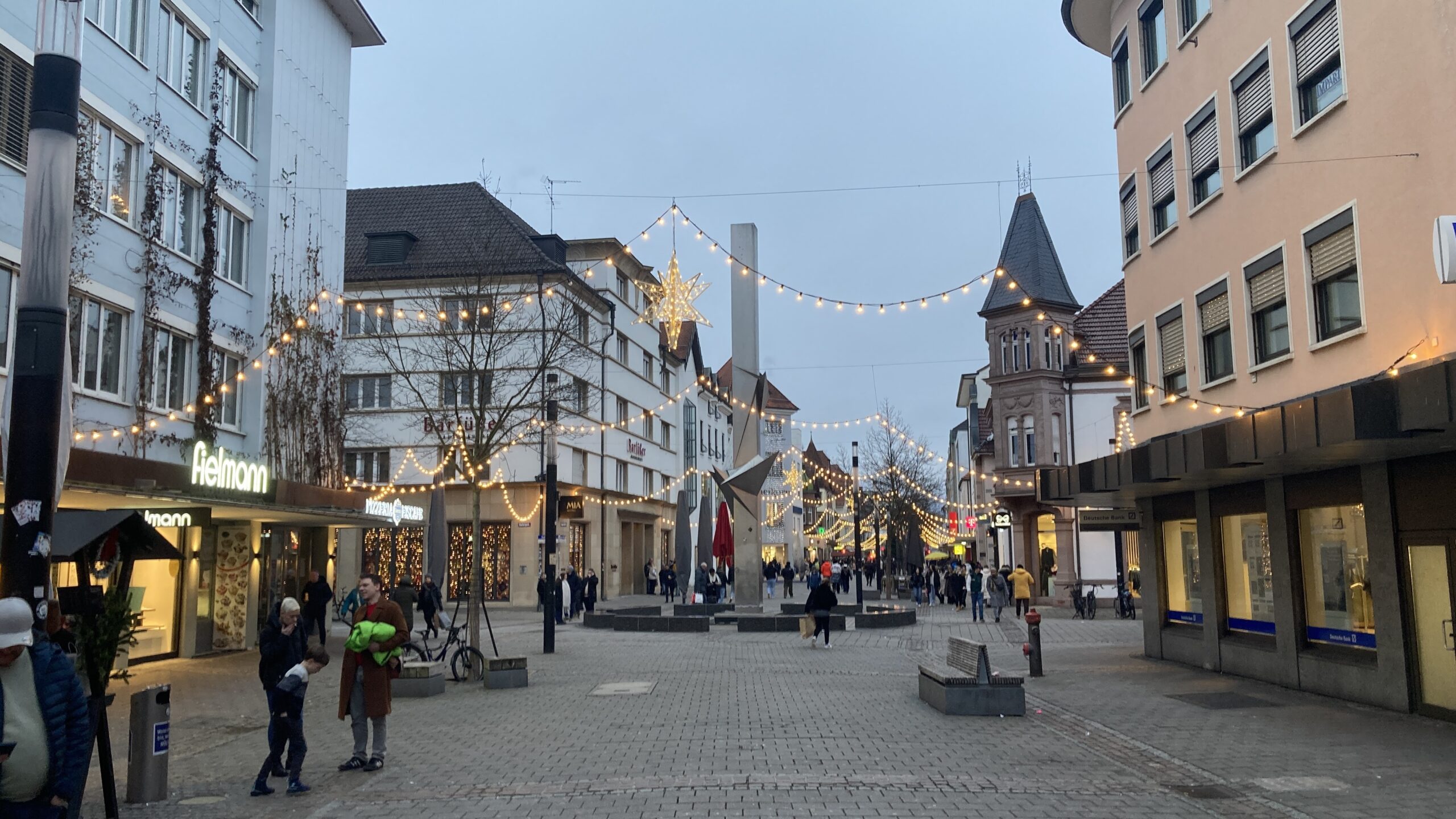 Vom Bahnhof aus bin ich direkt in die Fußgängerzone gelaufen. Je weiter ich ging, desto freundlicher wirkte die Atmosphäre – denn überall leuchtete noch Weihnachtsbeleuchtung. Es war später Nachmittag, die Lichter der Sterne, Bögen und Ketten wurden immer intensiver und tauchten die Straßen in ein warmes Licht. Zwischen den vielen Menschen ging es vorbei an kleinen Verkaufsständen, an festlich geschmückten Weihnachtsbäumen und an Schaufenstern, in denen sich die Lichter schön gespiegelt haben.