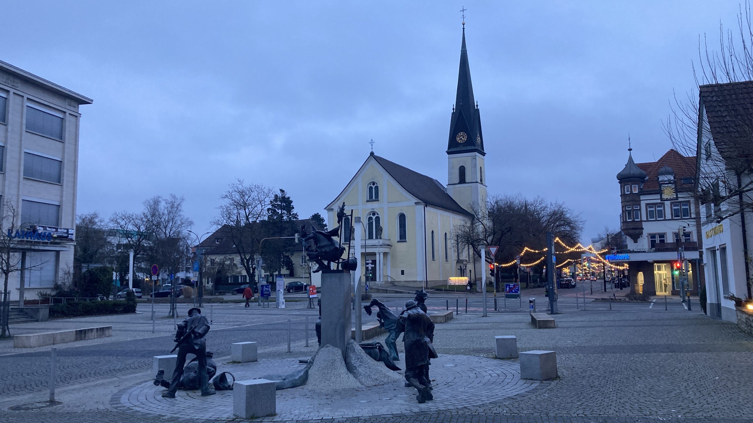 Die Architektur entlang der Fußgängerzone hat mich überrascht – modern und gleichzeitig charmant, mit kleinen Details, die im Winterlicht besonders wirken. Weiter hinten tauchte die Kirche auf, daneben der Brunnen mit den Narrenfiguren, die typisch für die Region sind. Und mittendrin ein großes „SINGEN“-Schild, das in kräftigen Neonfarben geleuchtet hat – ein echter Blickfang.