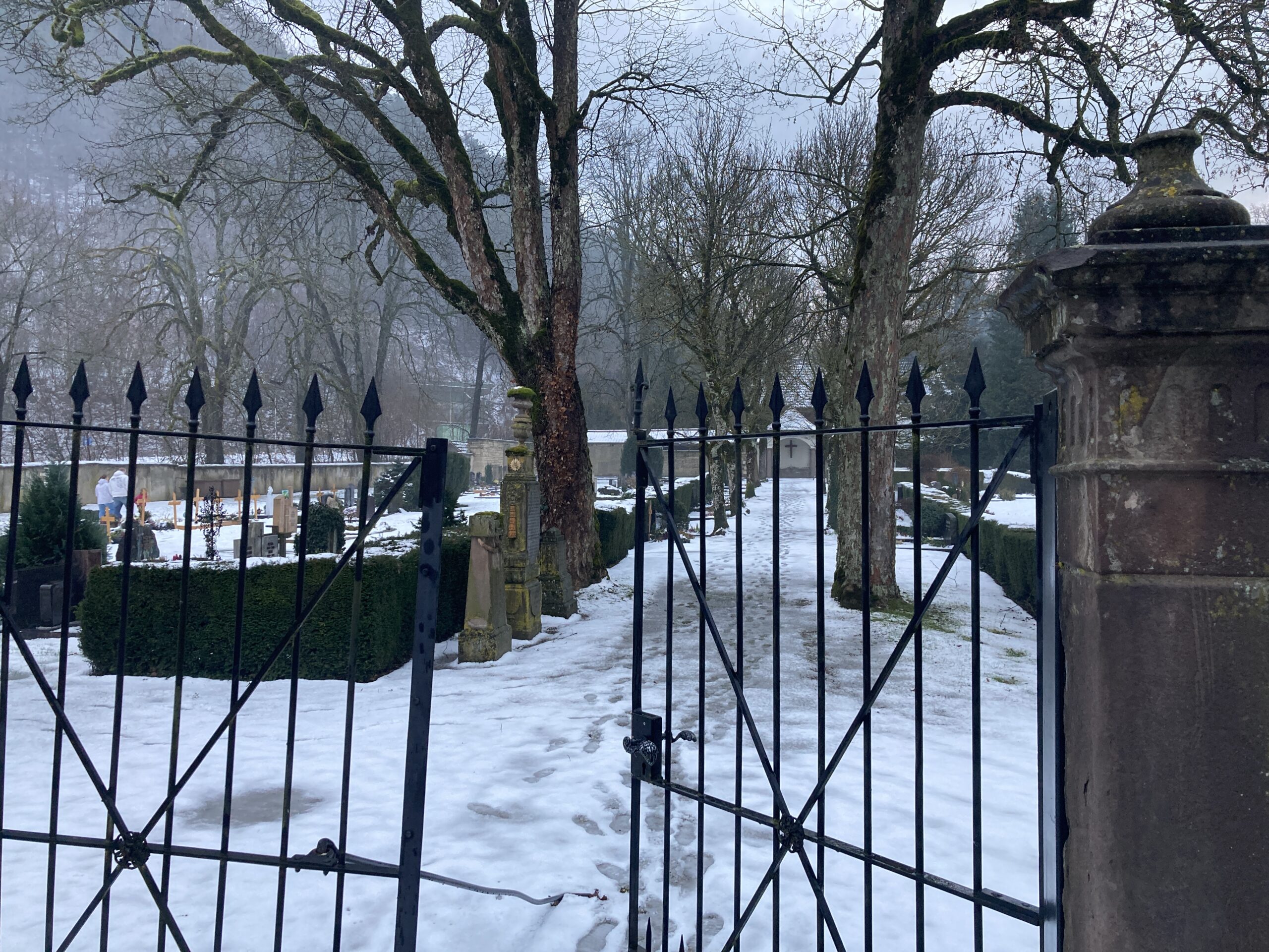 Nach der Stadt ging es weiter bergauf. Ein schmaler Weg führte mich durch verschneite Hänge und Wälder. Der Schnee knirschte unter den Schuhen, und überall lagen kleine Spuren – von Rehen, Hunden, Spaziergängern, die vor mir unterwegs gewesen waren. Unterwegs kam ich an alten Ruinenteilen vorbei, an verwitterten Mauern und einer Bank, die einsam im Winterwald stand. Mit jedem Meter wurde die Sicht weiter.