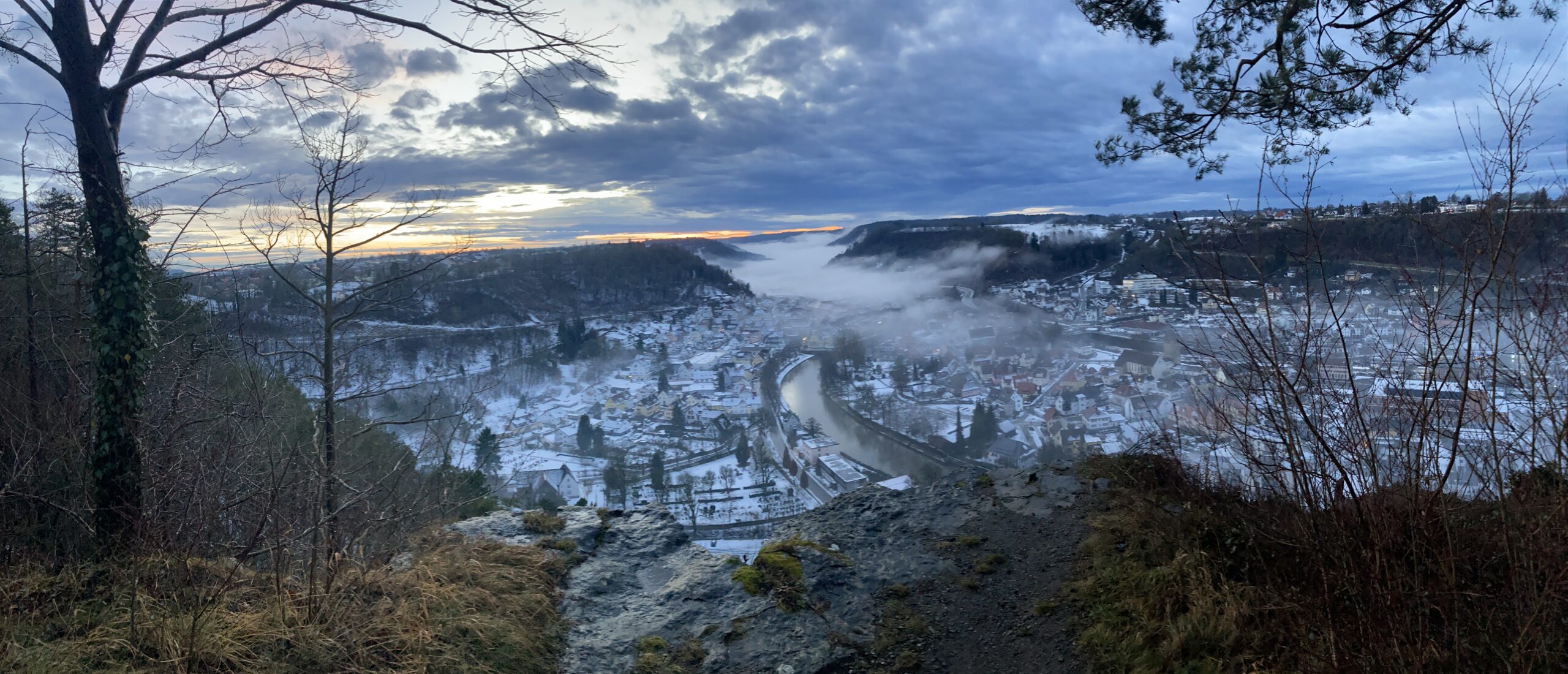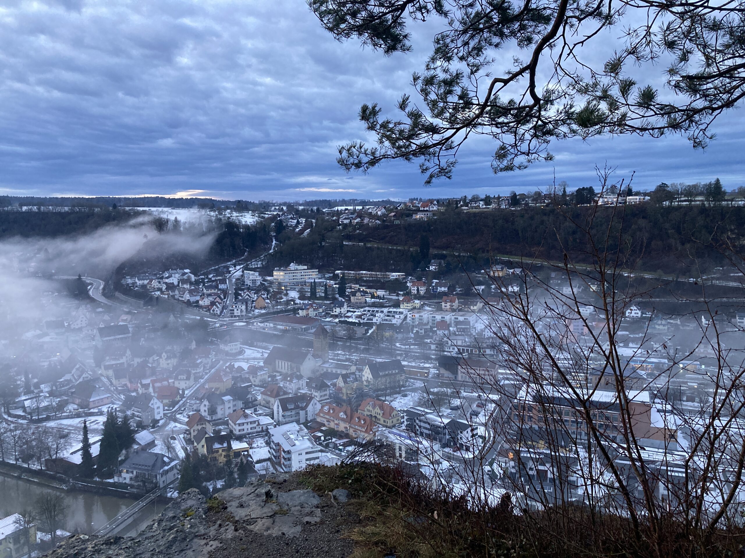 Oben angekommen öffnete sich ein beeindruckendes Panorama über Sulz. Der Nebel lag in dünnen Schichten über der Stadt, und zwischen den Hügeln stieg er langsam in die Höhe. Über mir färbte sich der Himmel in der beginnenden Blauen Stunde – ein Mix aus Silbergrau, sanftem Blau und den ersten Abendtönen.