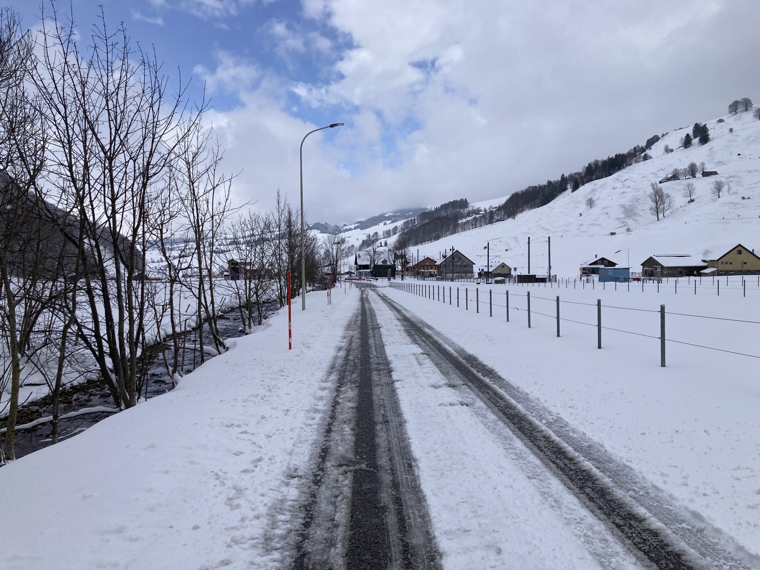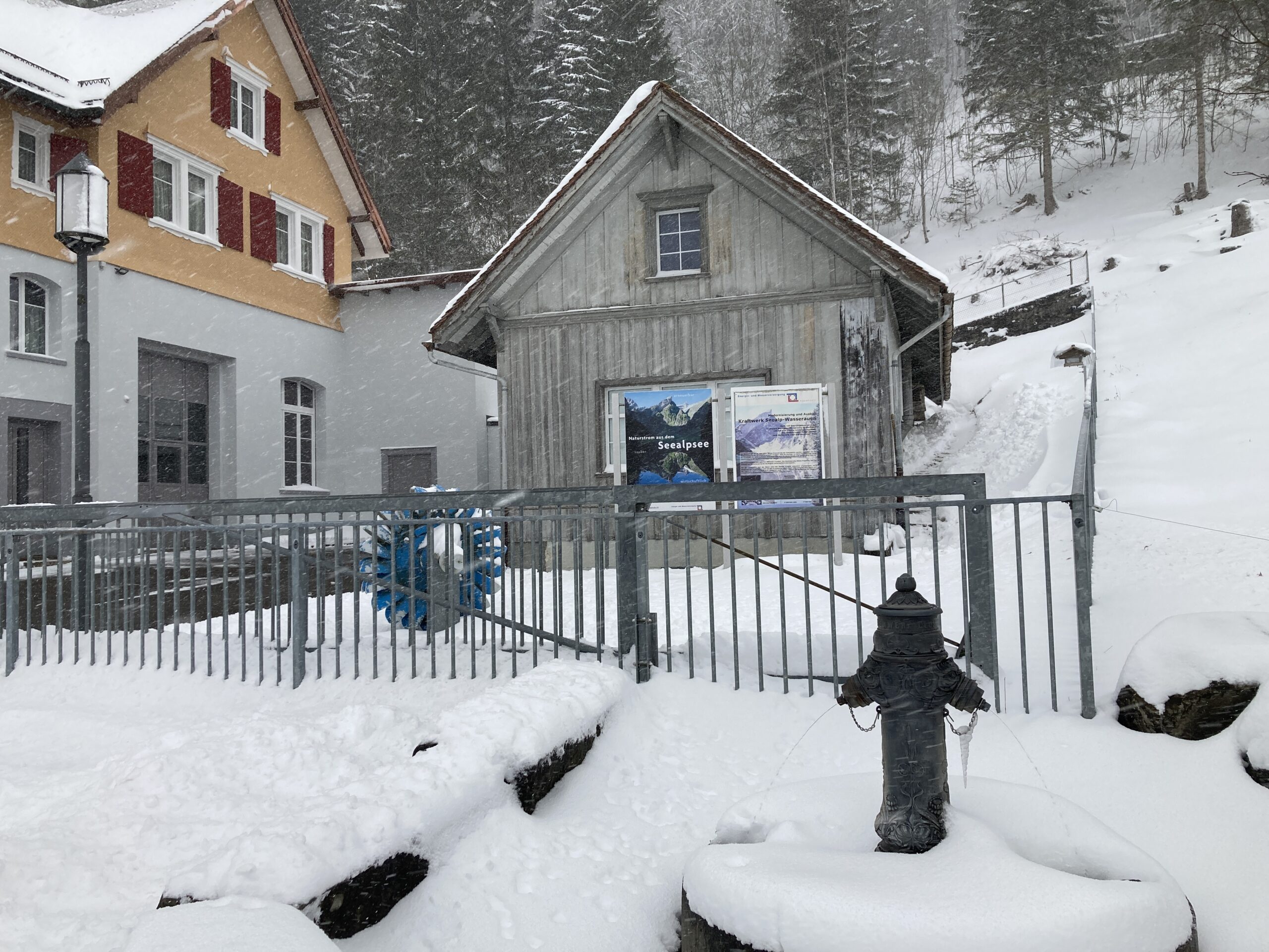 Von hier aus beginnt der Weg hinauf zum Seealpsee – eine der bekanntesten Wanderungen in der Region. Ende März, eigentlich schon Frühling.
