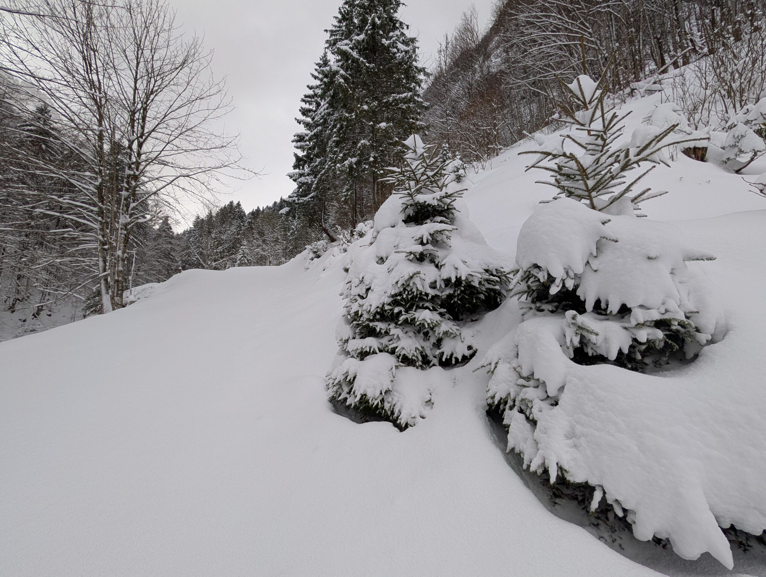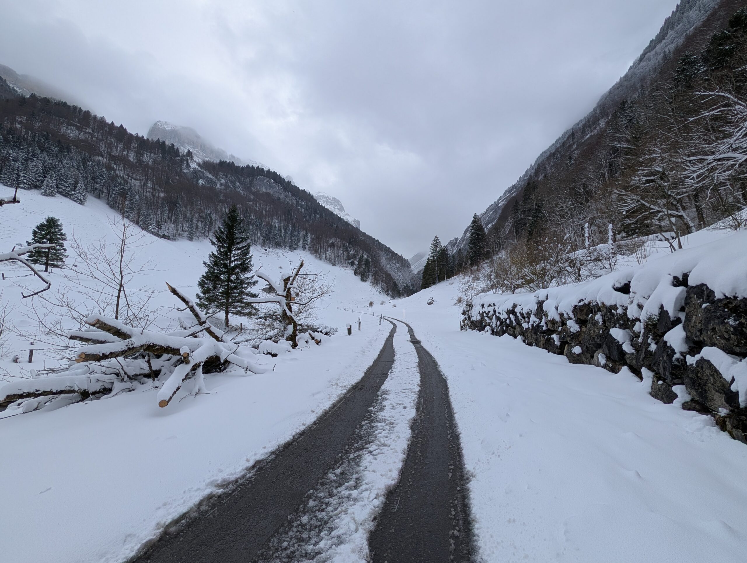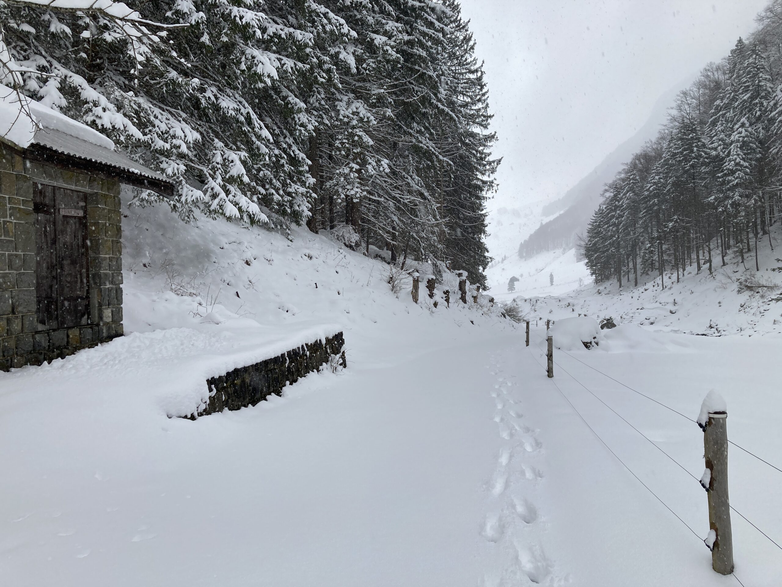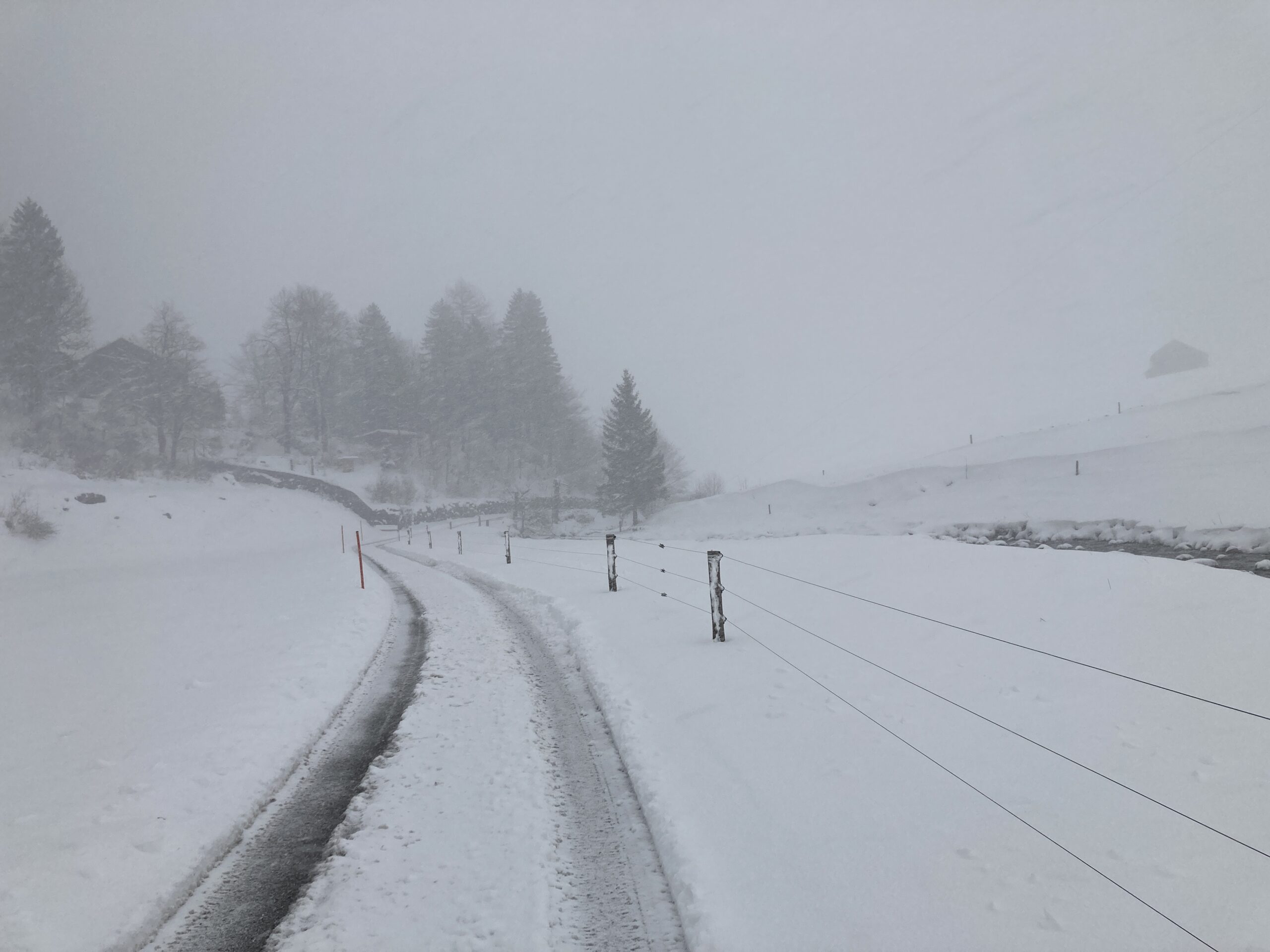Der Weg ist kaum erkennbar, etwa 20 cm frischer Schnee liegen auf dem Boden.